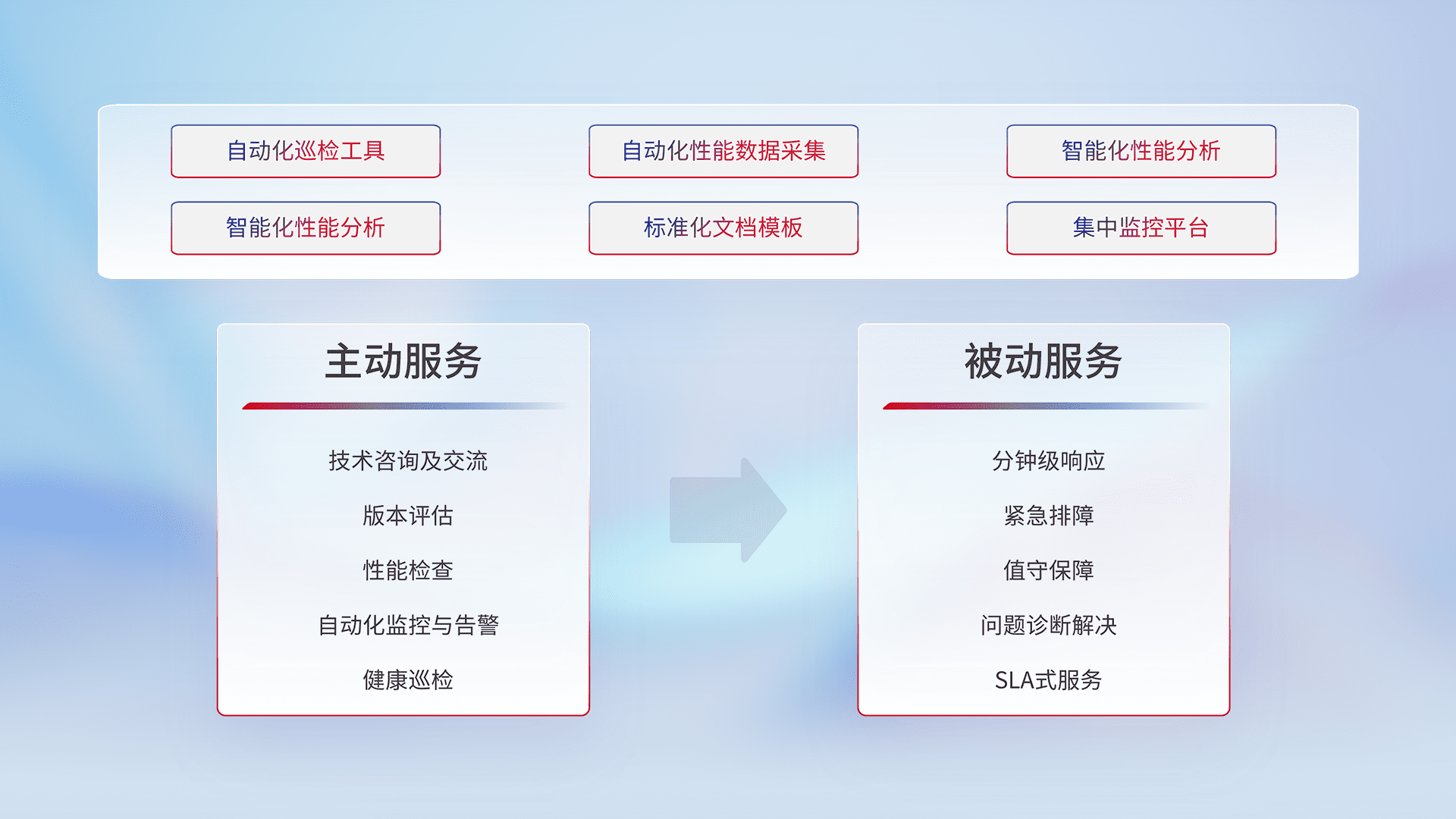 智能化工具和标准化文档,,保障服务质量,,,提供主动服务(包含技术咨询、、版本评估、、、、性能检查、、自动化监控与告警、、健康巡检)和被动服务包含(分钟级响应、、、、紧急排障、、、值守保障、、、问题诊断解决、、SLA服务)。。